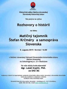 V priestoroch Knižnice slovenskej štátnosti Matice slovenskej v Bratislave sa dňa 8. augusta 2019 konala ďalšia prednáška s diskusiou z cyklu Rozhovory o histórii. Tento pravidelne konávajúci sa historicko-debatný formát Historického odboru MS a Slovenského historického ústavu MS prilákal do publika opäť značný počet účastníkov, ktorí si tentoraz prišli vypočuť prednášku na tému Matičný tajomník Štefan Krčméry a samospráva Slovenska. Prednášateľom bol historik Mgr. Lukáš Krajčír, PhD. zo Slovenského historického ústavu MS, ktorý sa téme samospráve Slovenska, matičným dejateľom a vôbec slovenským verejným činiteľom medzivojnového obdobia venuje systematicky už niekoľko rokov.