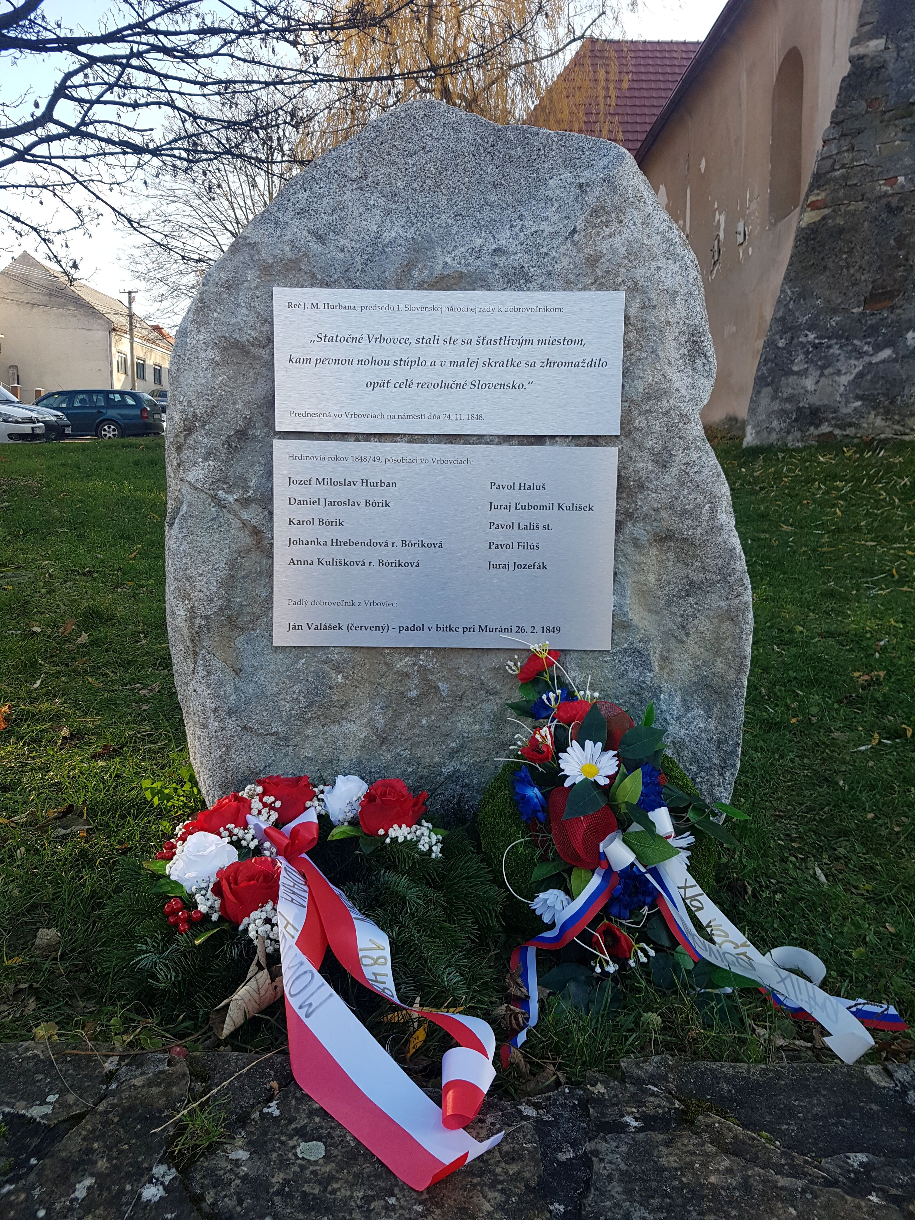 Na jednej tabuli je úryvok z reči Jozefa Miloslava Hurbana k dobrovoľníkom na námestí slovami – „Statočné Vrbovce, stali ste sa šťastlivým miestom, kam pevnou nohou stúplo a v malej skratke sa zhromaždilo opäť celé revolučné Slovensko“…